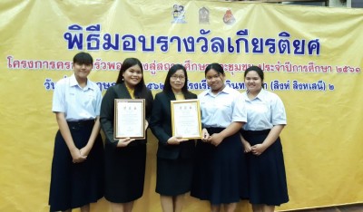 วันพฤหัสบดีที่ 23 พฤษภาคม 2562 ดร.นิติกรณ์ ฉันท์วงศ์ชนะ ผู้อำนวยการโรงเรียนสงวนหญิง รับมอบโล่จากลูกสงวนหญิง ในโอกาสได้รับ รางวัลชนะเลิศ การประกวดโครงงาน Thailand Junior Water Prize 2019 โครงงาน เรื่อง ศึกษายับยั้งการทำลายไคติน ของเปลือกไข่ยุงลาย แทนการใช้สารเคมี' และมอบเกียรติบัตรเป็นกำลังใจให้กับ นักเรียนและคุณครูที่ปรึกษาโครงงาน