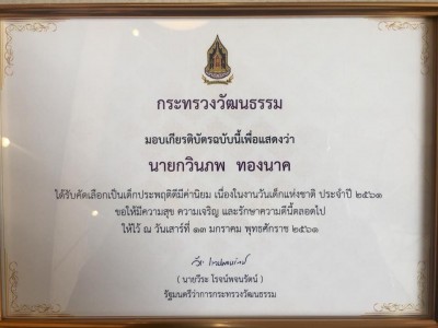 วันเสาร์ที่ 13 มกราคม 2561 'วันเด็กแห่งชาติ' 77 จังหวัด 77 คน ... เด็กประพฤติดีมีค่านิยม จังหวัดสุพรรณบุรี นายกวินภพ ทองนาค นักเรียนโรงเรียนสงวนหญิง รับเกียรติบัตรจากรัฐมนตรีว่าการกระทรวงวัฒนธรรม เนื่องในงานวันเด็กแห่งชาติ ประจำปี 2561 ณ หอประชุมศูนย์วัฒนธรรมแห่งประเทศไทย