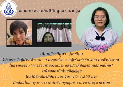ขอแสดงความยินดีกับนักเรียนที่ได้รับรางวัลในการแข่งขัน 'การอ่านทำนองเสนาะ แสงประทีปส่องฉันทลักษณ์ไทย' จัดโดยสถาบันไทยปัญญ์สุข