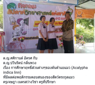 4 สิงหาคม 2559 นางสาวณิชา ศรีโมรา ม.5/9 และนางสาววรันธร เพชรยวน ม.5/9 ได้รับรางวัลชนะเลิศ การแข่งขัน 'การเตรียมสไลด์การแบ่งเซลล์แบบไมโทซิส' ในสัปดาห์วิทยาศาสตร์ ปี 2559 โดยคณะวิทยาศาสตร์และเทคโนโลยี มหาวิทยาลัยราชภัฏนครปฐม คุณครูผู้ฝึกซ้อม ครูจิตติมา ดมหอม และคุณครูกฤติยา เหมรี