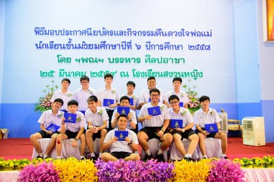 25 มีนาคม 2559 พิธีมอบใบประกาศนียบัตรและคืนดวงใจพ่อแม่ ของนักเรียนชั้นมัธยมศึกษาปีที่ 6 ปีการศึกษา 2558